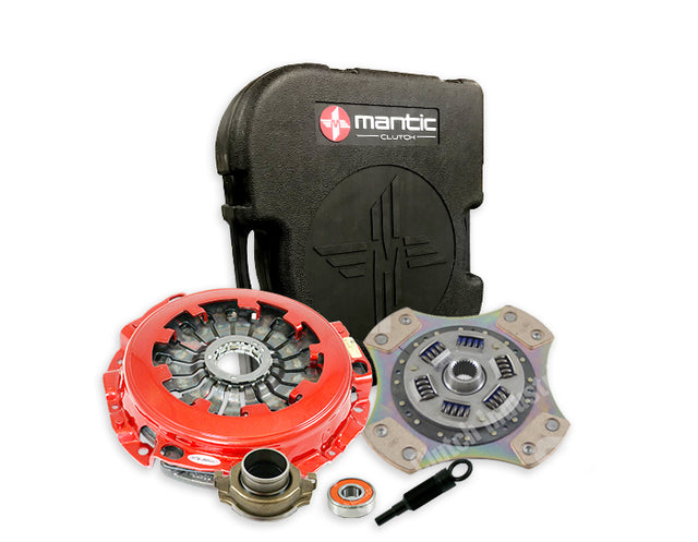 Designed and manufactured to replace the clutch system installed as Original Equipment, a Mantic Stage 4 replacement clutch kit offers a strong torque capacity increase. Each component has been thoroughly tested and developed for a specific application. This range provides a Quality Assured replacement part that will meet or exceed the requirements of the original unit. After 70 years of experience in developing and manufacturing clutch kits for OEM and Aftermarket use, CI is the trusted source for a complete range of Clutch Kits suited to your vehicle. MANTIC STAGE SERIES COVER ASSEMBLY: Mantic Stage 4 clutch kits feature a 20% increase (over original equipment) in clamp load for increased torque capacity. SPHEROIDAL GRAPHITE CASTINGS: Approximately 300% stronger than a standard casting this material (sometimes referred to as an Anti Burst casting) not only increases strength by up to 3 times, it also improves heat dispersion. BALANCED COVERS: To insure that the clutch system performs at maximum efficiency and that no unwanted vibration is generated as the cover spins, all Mantic Stage cover assemblies undergo a 2 stage balancing process . CERAMETALLIC FRICTION MATERIAL CLUTCH PLATE - NON CUSHIONED: The Torque Capacity of a Clutch Plate can be increased by using exotic cerametallic friction material featuring a higher coefficient of friction. However, cerametallic material reduces pedal feel and results in more sudden clutch engagement, reducing street driveability. Mantic Stage 4 Clutch Kits feature cerametallic friction material on both sides of the clutch plate, and no segment cushioning. This results in a strong torque capacity increase compared with Stage 2 and more sudden engagement compared with Stage 3 kits. This type of configuration is more suitable to rally and drift still driving; and less so for street driving. If you require a significant torque capacity increase, but still wish to drive your vehicle on the road, we recommend you purchase a Mantic Track multi plate clutch kit.