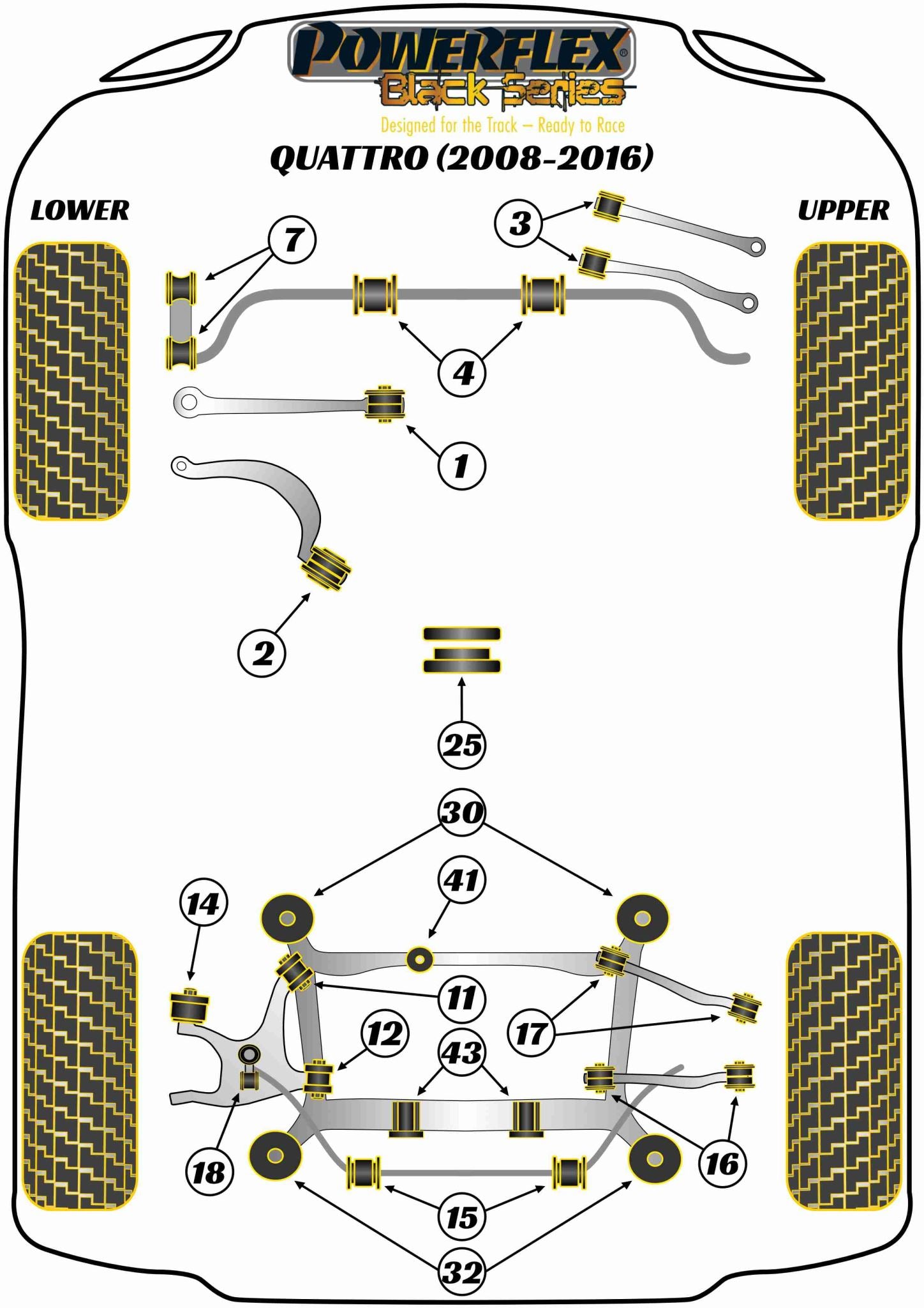 POWERFLEX Black Series bushes are manufactured using our Black 95 Shore A compound to provide maximum control of chassis geometry. They are designed for the Track, ready to Race and are engineered to be the best. This compound can be up to 80% more resistant to load than standard rubber and 25% stiffer than our purple performance material. If your requirements are purely for the ultimate in handling and chassis performance then Powerflex Black Series are unique, offering the most precise and accurate alignment for your chassis.