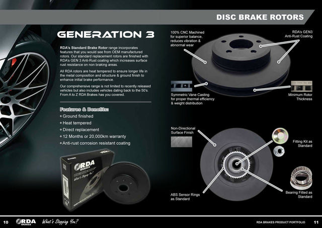 RDA Brakes Standard Brake Rotor range incorporates features that you would see from OEM manufactured rotors, with the standard replacement rotors finished with RDA’s GEN 3 Anti-Rust coating which increases surface rust resistance on non braking areas.